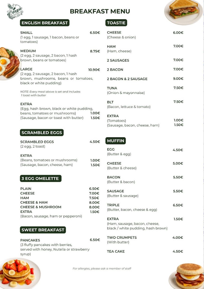 (2 egg, 2 sausage, 2 bacon, 1 hash brown, mushrooms, beans or tomatoes, black or white pudding)